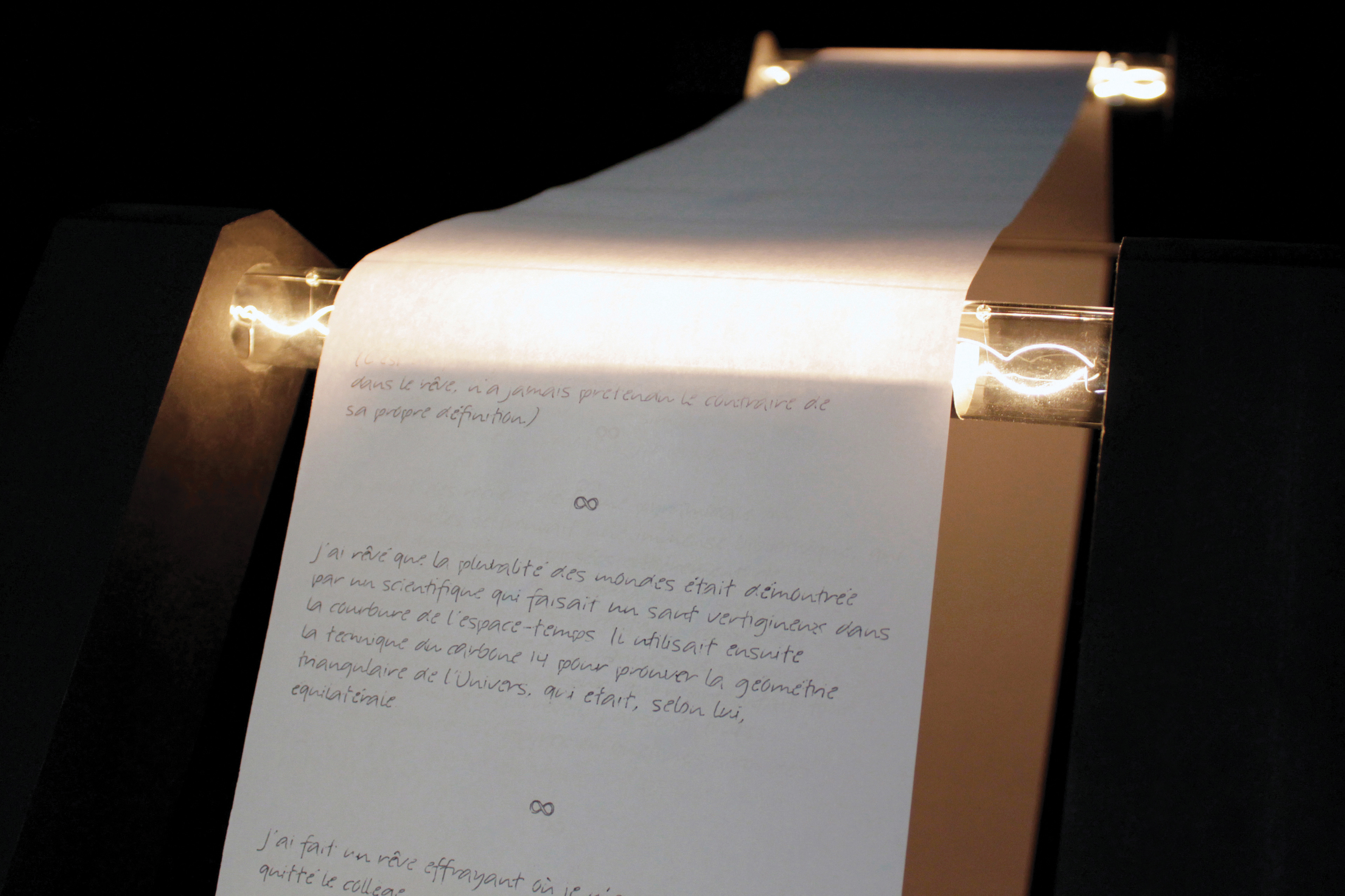 Un bras robotisé s’active à transcrire les récits de rêves élaborés par un générateur de texte aléatoire. Mais en cours de processus, au contact de la lumière, l’encre avec laquelle sont consignées ces histoires disparaît progressivement, à l’image de nos rêves qui s’évaporent au réveil. Le papier, à nouveau vierge d’inscriptions, est réinséré en boucle dans la machine, dans une entreprise d’archivage à la fois utopique et inutile.