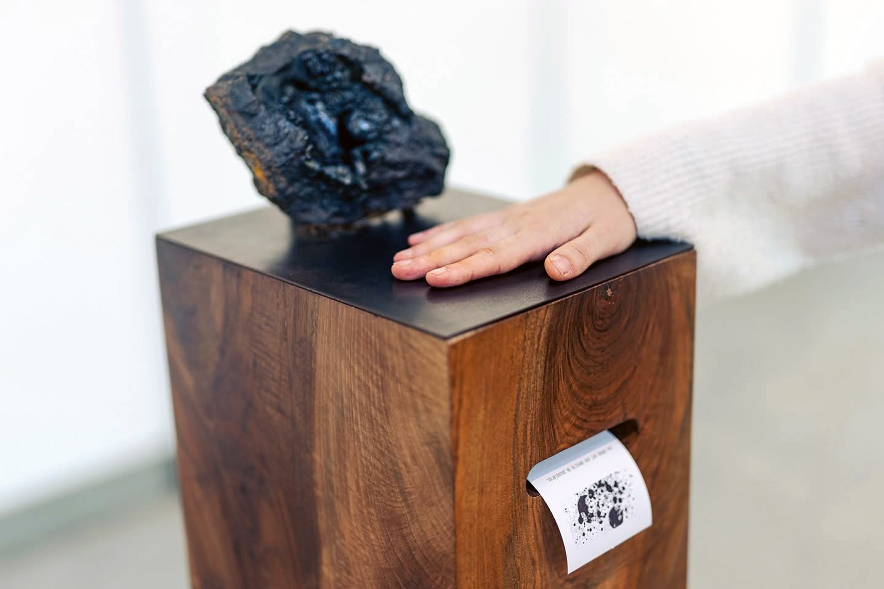 Cette œuvre interactive invite le public à poser la main quelques secondes sur un capteur tactile connecté à une météorite. Le spectateur reçoit alors un message qui lui est spécialement dédié, un texte aléatoire généré par la fluctuation d’ondes radio en provenance du cosmos.