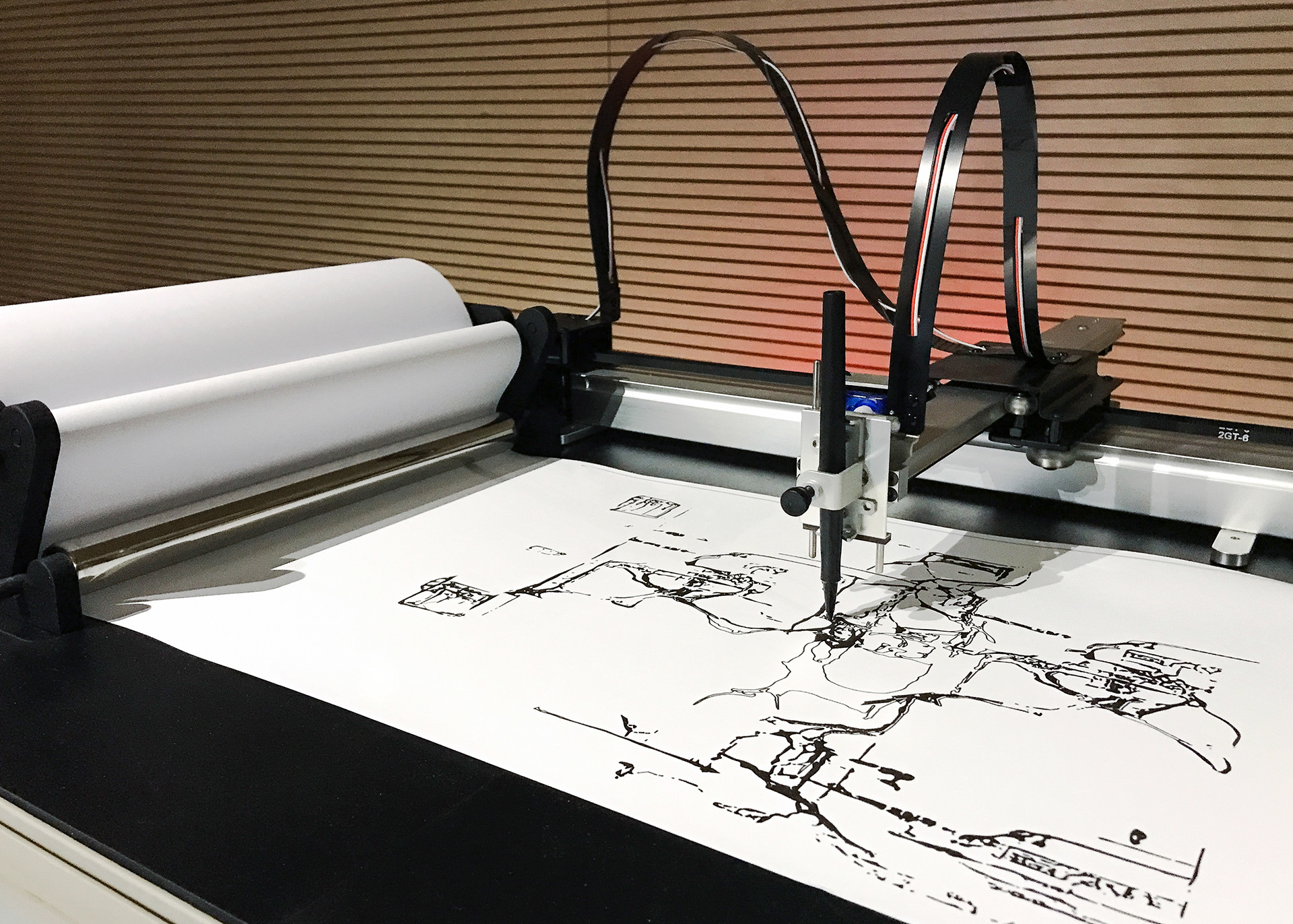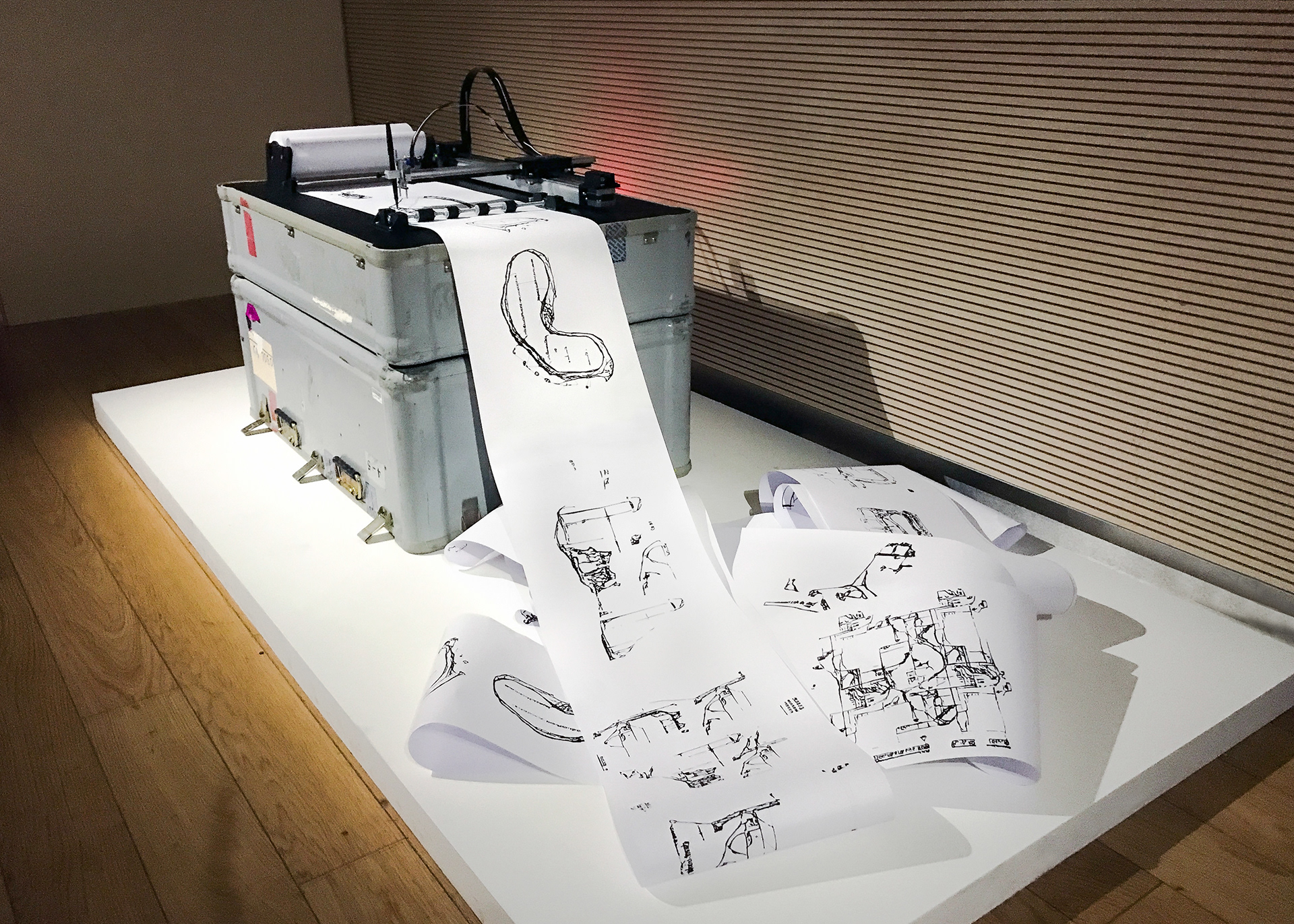 L'installation générative est composée d’un bras robotisé capable de reproduire en temps réel, avec un feutre sur papier, les schémas conçus par le réseau de neurones. Implanté dans un flight-case ayant autrefois abrité un satellite du CNES maintenant obsolète, le système comporte un rouleau de papier qui défile automatiquement dès qu’un dessin est terminé, de manière à ce que la machine soit entièrement autonome.